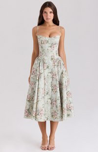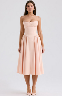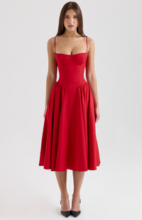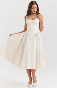 Introducing the Hannah Midi Dress, your new go-to for effortless style across every season. Crafted from a breathable twill fabric, 'Hannah' is designed for both comfort and impact. The expertly boned bodice cinches your waist, creating a beautifully defined silhouette, while the romantic sweetheart neckline features supportive underwired cups.