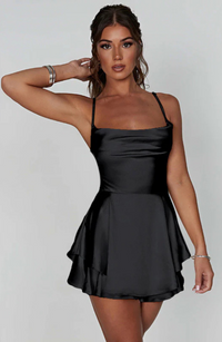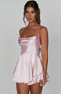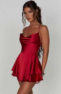 Radiate in the Natalia playsuit, a design cut from our luxury stretch satin that hugs the body like a glove. With a cowl neck and ruffle detail shorts, style yours with waved hair and a mini bag.