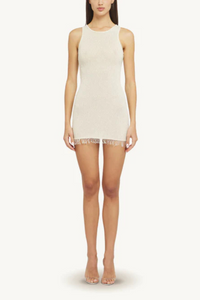 Designed for effortless style, the Natalie Mini Dress features a comfortable slip-over design and a touch of light stretch for ease of movement. The true showstopper is the sequinned yarn fringe hem, adding playful movement and an extra dose of glamour with every step.